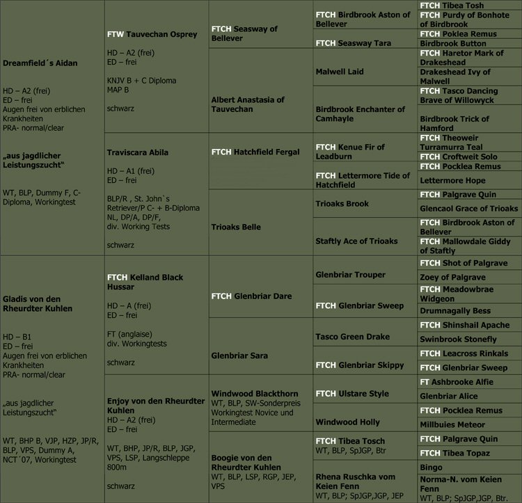 HD A2, ED 0/0 Augen frei 2/08, PRA-Frei (N/N) u.OptiGen clear über Eltern CNM-Gentest: clear / frei Formwert sehr gut Zuchtzulassung 3/07, tauglich für die