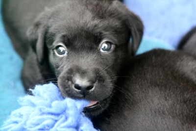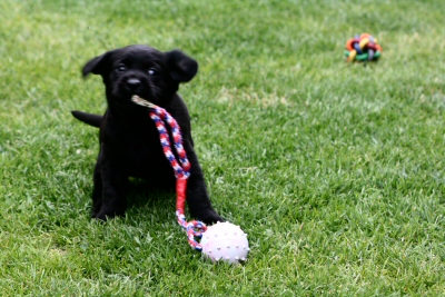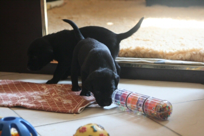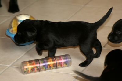 Spielzeugen. Einmal täglich füttern wir etwas Welpenmilch zu.
