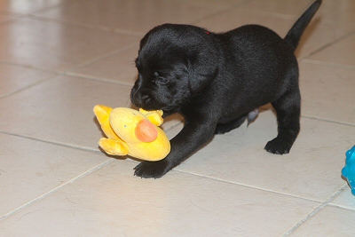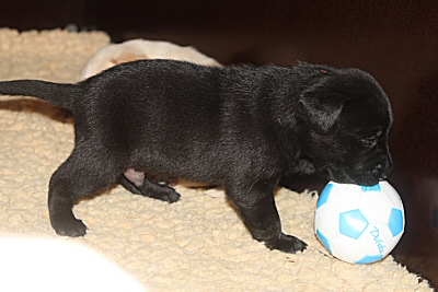 Die Entwicklung der Welpen geht rasant weiter. Sie können nun sehen und hören, die Zähne kommen langsam durch, sie wedeln und nehmen nun auch Spielzeuge wahr und fangen auch kleine Spielchen mit den Geschwistern an.
