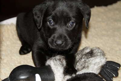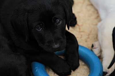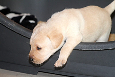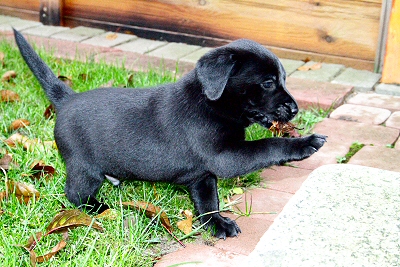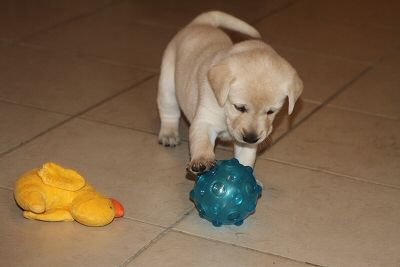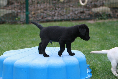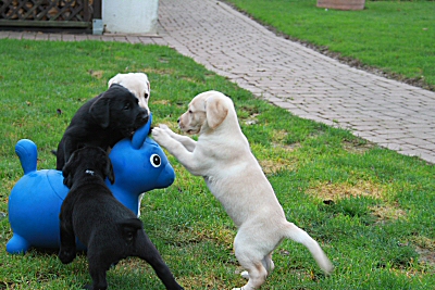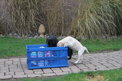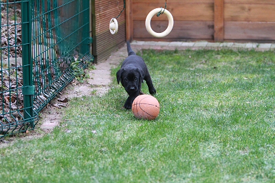 Es ist sehr schön zu sehen wie die 4 sich immer mehr Lebensraum erobern. Sie verlassen jetzt die Wurfkiste, bewegen sich problemlos auf den Fliesen, klettern in Körbchen, spielen, raufen und apportieren kleine Stofftiere.