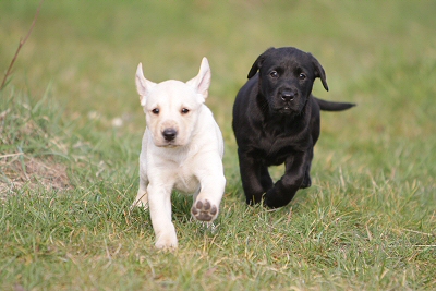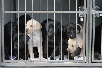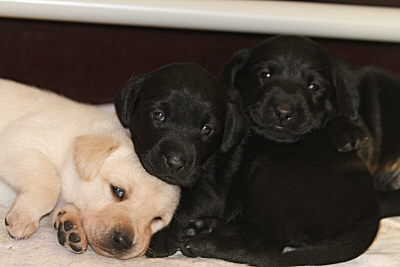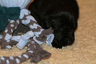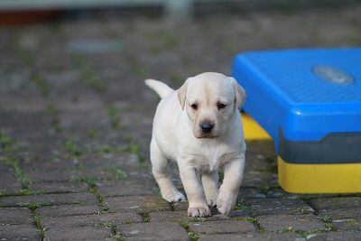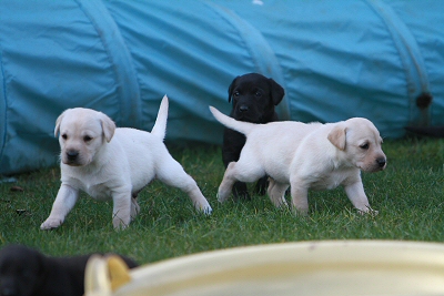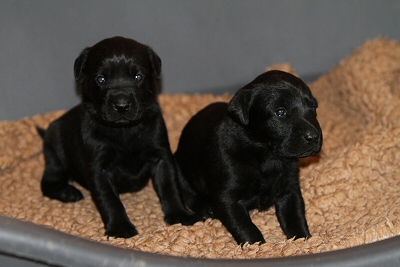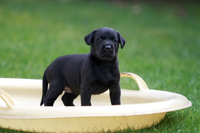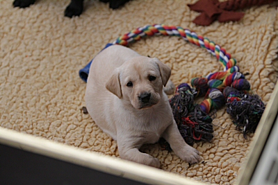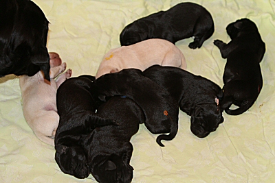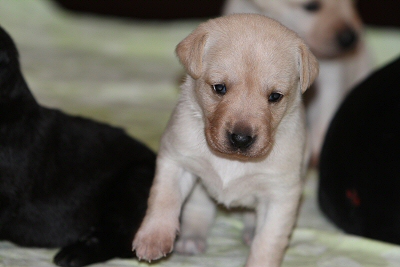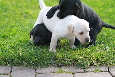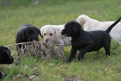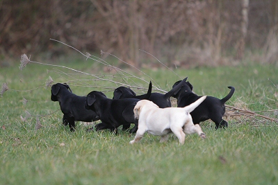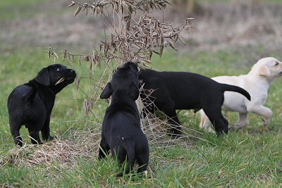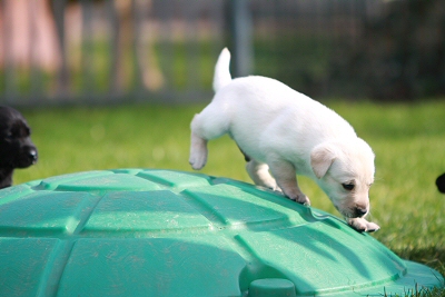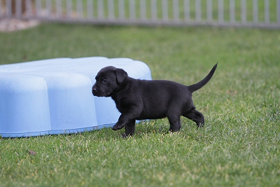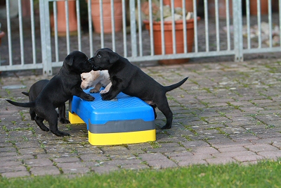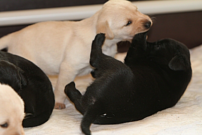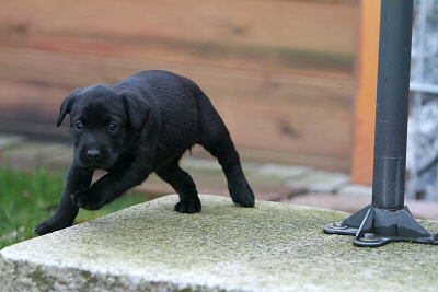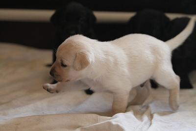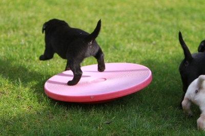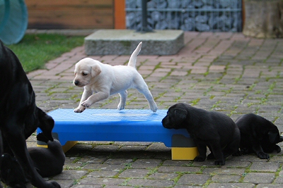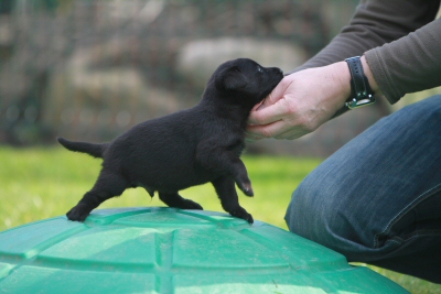 Die Welpen verlassen die Wurfkiste selbstständig und können schon recht gut auf
